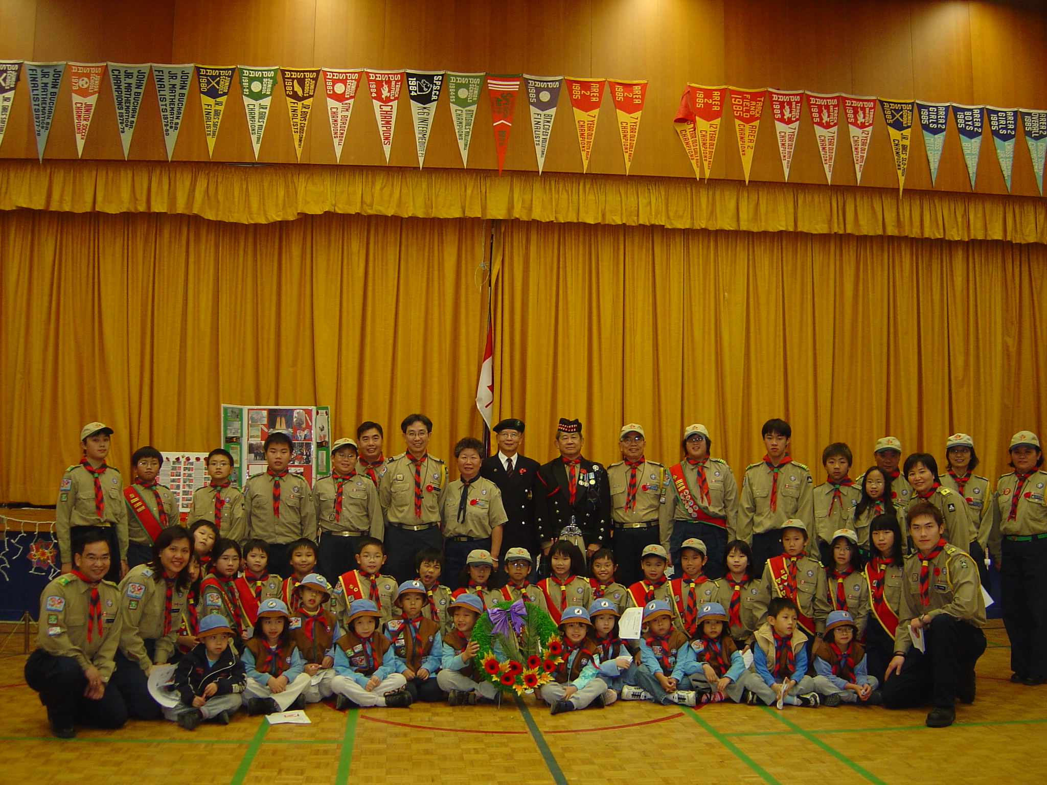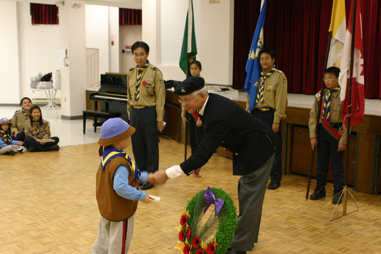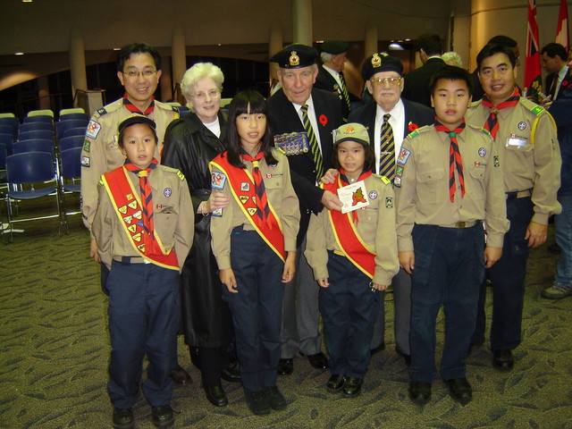 襯托在感謝卡上,及號召所有童軍將感謝徽章送給退伍和現役的軍人,讓童軍用一個獨特的方式向曾經和將會為世界和平與自由作出貢獻的人致敬。 愛靜閣第38旅在11月6日(星期日)下午響應愛靜閣地域的呼籲,參加了由士嘉堡市政府在市政府中心(Scarborough Civic Centre)主辦的大型紀念活動。全旅首先在市政府中心附近集合,原來有很多退伍軍人,現役軍人和制服團體(包括聖約翰救傷隊、空軍少年團和男、女童軍 等)的隊伍早已到場參加大遊行。在總指揮的號令,所有隊伍在儀仗隊的帶領下操向市政府中心大樓,大樓門前早已下了半旗致哀。進入大樓內,我們靜待國觴日儀 式的開始。準時二時正,司儀宣佈儀式正式開始。 我