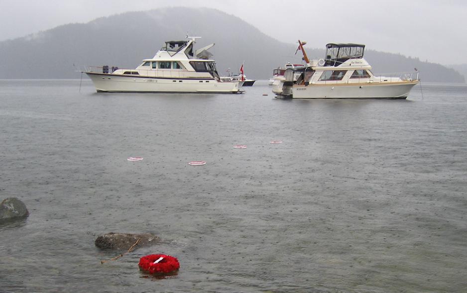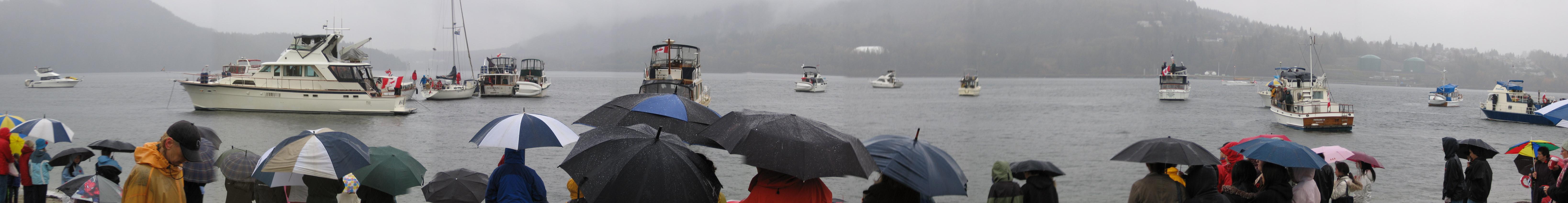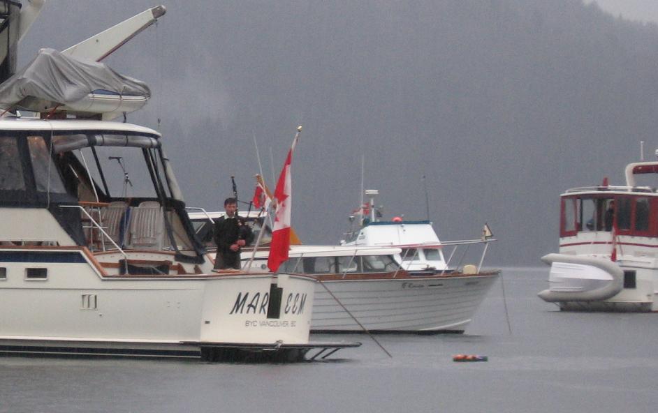 時近十一時,船上的樂聲由蘇格蘭風笛手及號角手的軍樂取替了,經主禮人簡短的介紹,領眾人頌唱聖歌,在連環數响鳴鎗禮中,進入默哀的兩分鐘。號角再次响