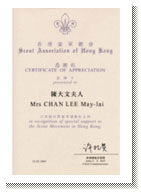 | 何存仁夫人獲頒感謝狀 Robert現為港島第10旅童軍團長兼港島西區助理區總監(童軍)。感謝狀是總會頒予已婚領袖配偶的獎勵。 |